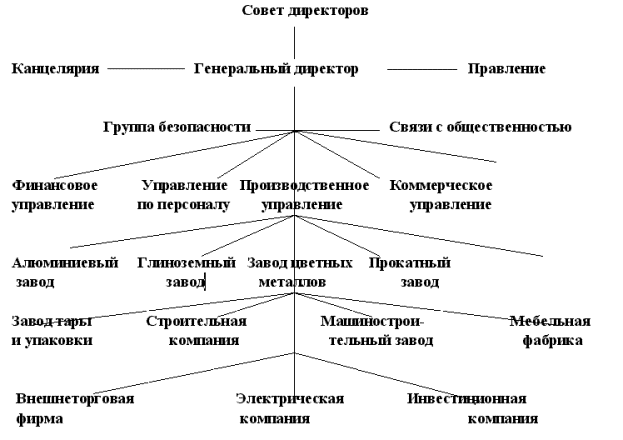 Виталий Зверев, генеральный директор металлургической компании, докладывал Совету директоров организационное построение компании. Схема спректированной им организационной структуры изображена на рис. Один из членов Совета директоров высказал сомнение, целесообразно ли иметь руководителю организации такое юольшое количество подчиненных, на что Виталий ответил :"Я не верю в теорию, согласно которой руководители должны иметь ограниченное число подчиненных. Это разбазаривает ресурсы и создает бюрократию. Все мои подчиненные – хорошие люди и знают, что они должны делать. В любую минуту они могут обратиться ко мне за помощью в решении любых проблем. Кроме того, я предпочитаю знать из первых рук, как каждый из них работает, указать на ошибки и недостатки немедленно. Почему заведующий секцией в универсальном магазине может иметь в подчинении 25-30 человек, то и я справлюсь. Я полагаю, что вы поставили меня на эту должность для того, чтобы я работал на компанию весь рабочий день"