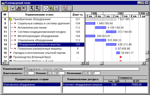Тесная связь между календарным планом работ и правилами их представления в бухгалтерской документации позволяет сэкономить значительное время, затрачиваемое на определение будущих амортизационных отчислений, затрат на обслуживание оборудования и других вопросов, связанных с инвестиционным этапом проекта. Программа достаточно гибко подходит к представлению данных о проекте, позволяя либо увязывать все этапы инвестиционной и дальнейшей операционной деятельности, либо описывать эти стадии проекта независимо.
