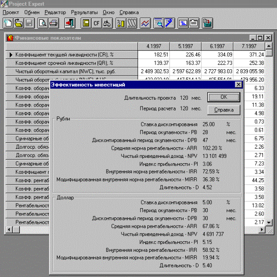 Результаты расчета проекта включают также набор наиболее распространенных финансовых показателей, включающих следующие группы данных: