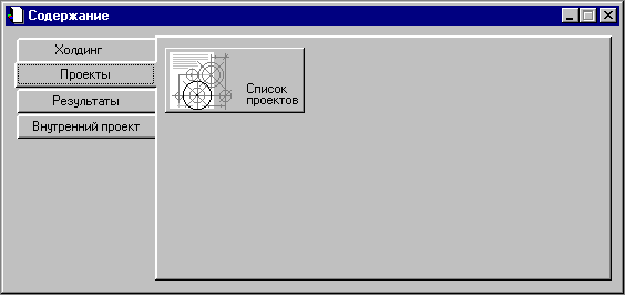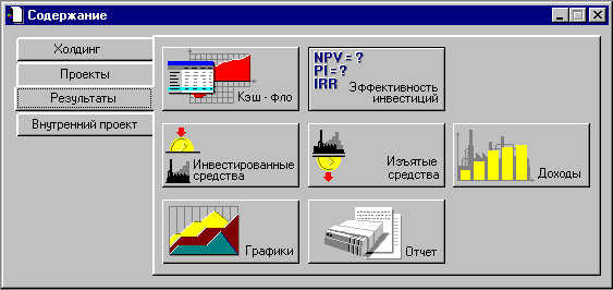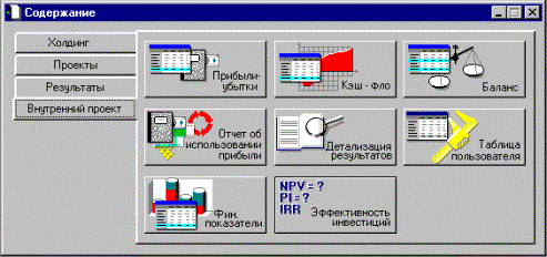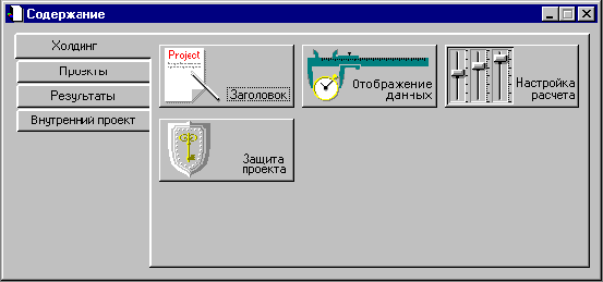 С точки зрения интерфейса работа с PIC Holding во многом напоминает работу с Project Expert: многодокументная среда(MDI), панель инструментов, панель подсказки, окно содержания с закладками. Похоже, также и начало работы: пользователь либо создает новый проект, либо открывает существующий, эти операции производятся также, как и в Project Expert. Файлы проектов PIC Holding имеют расширение *.PHF ( Project Holding File ). Как и в Project Expert за каждой кнопкой содержания стоит вызов либо диалога, либо MDI-окна. Далее идет краткое описание таких диалогов и окон.
