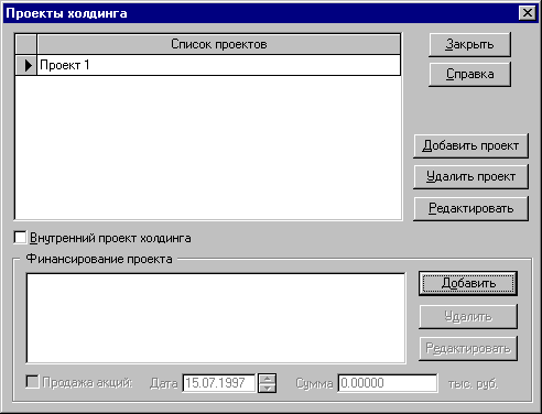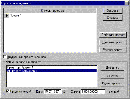 Устанавливая в диалоге "Список проектов" опцию "Продажа акций" пользователь тем самым создает еще один финансовый поток в холдинге: