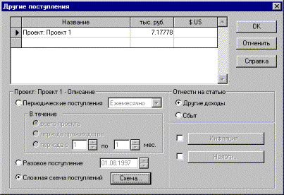 Аналогично "Кредиты и займы возвращенные" и "Поступления от продажи акций" по проектам показаны в таблице "Изъятые средства", а "Проценты полученные" и "Дивиденды полученные" по проектам показаны в таблице "Доходы". Потоки по проектам из таблицы "Доходы" добавляются также во внутренний проект холдинга. После расчета холдинга их можно увидеть также в диалоге "Другие поступления" внутреннего проекта: