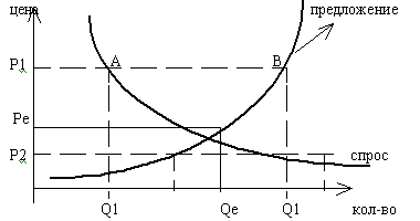 Если государство вводит “потолок” цен на какой - то товар, оно должно стремиться уравнять спрос и предложение либо в точке А (сократив спрос), либо в точке В (увеличив предложение).