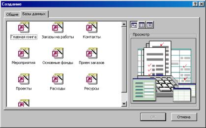 Если при запуске Access Вы выберете пункт «Мастера, страницы и проекты баз данных», то появляется список шаблонов:
